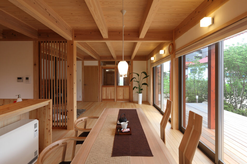 大黒柱は木曽東濃檜、梁や桁には安芸佐伯杉を使用。職人の手で丁寧に組み上げた本格木造は、年月とともに味わいを深めます。漆喰や珪藻土が調湿・消臭効果をもたらし、木のぬくもりと自然素材の優しさに包まれた空間です。